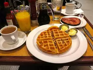 Everything here was delicious and the service was great. Great coffee! The best part of the meal was the pecan waffle. Lots of big pecan pieces, fluffy with just enough crunch. A must try. Great historic atmosphere.