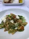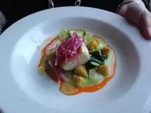 Food was very good. I had halibut. Nicely done and presented beautifully. Husband had spaghetti. Disappointed that the sausage had lamb in it so he got it without meat. A little spicy Really wanted to eat outside but the tables were full.