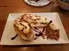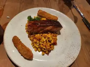 Main dish was very very good. Food was tasty, well prepared, well presented, good portion. Only thing bland was the dessert, had panacotta. Tasteless. Main room very noisy, ended up sittingboutside by fireplace, nice.