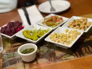 Food was good and plenty! We order one appetizer (gefilte fish $7) and one entreé (cholent $19,95) for two, and it was more than enough. Cholent was delicious. Besides the bread they also serve a few salads as starters, some very good, like the corn with dill. Food tasted like homemade and service was friendly. Average $20 for entreés, but you can share, and 18% tip is included in the bill.