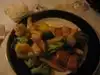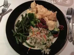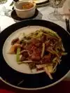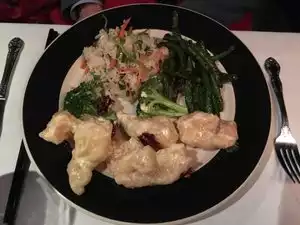 Went for the special lunch, a great value. Started with very traditional fried pork dumplings and spring rolls. Mains were very different, Mandarin prawns, Crispy duck Both seved with walnuts, broccoli and white rice. Prawns were large and generous, duck not as crispy as we'd hoped because of the sauce on top. Both very tasty. Ice cream for dessert. We have been coming here since 1988 and not disappointed. The dining room is surrounded by large, gold dragons.