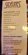 Sidelines has a PrimeRib special that is always good and tender. It comes with broccoli and salad. The service is also very good here. As soon as I finished my salad my Prime Rib was there. It's close to my hotel and the food is always good. I recommend Sidelines for a good meal.