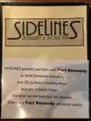 Sidelines is a short walk from the hotel we stayed. The staff is quite helpful, frindly and efficient. You do not wait long for a server to to appoach your table and ask what you would like. There is a variety of beers on tap and some bottled beer. The menu has a large and varied number of choices. I had the pulled port sandwich which was quite filling (don't know what my wife had). Prices ar reasonable. The only negative is that if you substitute fries for something else, say tater tots, there is an additional $2 charge. This is not divulged by the staff when ordering.