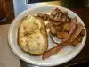 Sit down and warm up the grills. Our grandson wanted to have his birthday breakfast here. We had no wait since we were there during the middle of the week. Weekends usually insure a wait. You are given buttermilk or chocolate pancake batter and you cook it on a grill. You can add chocolate chips, blueberries, pecans,bananas, strawberries to the cooked product. The teenagers decided to show their artistic talents and make different figures of the batter. They won't win any art prizes but they had fun. We, also, had sides of "loaded" potatoes, breakfast potatoes and bacon. It was a god way to start the day and fun for all.