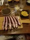 The food was above average, presentation poor. The cutting board used allowed the unlabled BBQ sauce to drip off the surface, and leak between the table slats onto my leg. The one waiter was overwhelmed by a small group of guests.