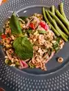 Went here with my wife and a friend. All of their drinks are delicious. I recommend the Thai ice tea with milk and their ice coffee. The food was very flavorful, but quite spicy! If you’re someone who can’t handle spice, I’d say medium spice is quite hot. Ordered the mackerel with coconut rice dish with medium spice and you definitely feel the heat. All their food was delicious. Hip and trendy atmosphere.