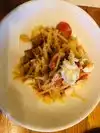 Last week I ordered this dish three times - delivered through Seamless. Each time it arrived still hot with peppers still tangy and the ground pork and wide noodles delightful.