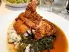 The trout was cooked well, the liver was seasoned nicely (needed an additional texture), the crab cake was just that- one crab cake, the fried chicken was juicy, the greens were so full of flavor, but the star of the show was the shrimp and grits hands down. I would go back for just that.