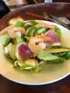 Had two orders of muscles for the table, each with a small slice of bread. Don’t they know it’s all about sopping up the broth? Had to order more bread for $9. The Clam chowder was scorched and the salad was over dressed and vinegary. The wine list was horrible with a 300% markup. Very expensive meal.