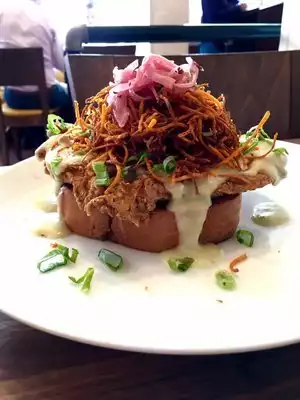 We had brunch here after church but ordered off the regular menu. Next time I’ll try a brunch entree. My wife had the chicken and dumplings, and my Mississippi girl cleaned her plate. I had the show bird sandwich which is really sort of a brunch dish; buttered toast, fried boneless chicken breast, sweet potato strings, onions and jalapeño gravy. I added an over easy egg. Delicious! I also had a good Bloody Mary. None of the silly garnishes, just a good spicy Bloody. There was a bottle of house hot sauce on the table that made it even better. Service was excellent. Our food was delivered almost as fast as at the counter service places. The restaurant is in an old storefront with high pressed tin ceilings and tile floors; it can get loud. They have gourmet ice cream sandwiches for dessert, but we were too full.