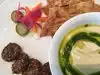 My husband and I both had bowls of the potato and leek soup- very good served with a nice bread. Our son had the chili which was also great as was the hummus and veggies. Nice casual lunch.