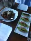 Cauliflower appetizer very good. Spicy barbecue though. Would be nice to have just cheese sauce as an option. Trio tacos with the potato and mushroom. Mushroom is spicy. Potato was very good. Mac and cheese is very good! The cheesecake desserts we had were amazing.