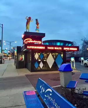 We took our 5 year old here while visiting Chicago and he loved the fact that the tray hooked onto the side of the car out of the window. I’d be lying if I said I didn’t love it too! Very neat, felt like we went back in time while eating our superdawg and supercheesie burgers. The strawberry shake was to die for!!! And the chocolate was amazing too - super thick and very rich! Friendly service, somewhat of a wait to get your food but you’re in the comfort of your car so we weren’t bothered. It was busy on a Thursday night. The person who took our order wasn’t great, and we had to repeat and verify our order multiple times, but the food and experience made up for this. Five stars! We will return next time we are in the Chicago area.