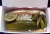 Take one small box, cram a poppy seed bun in it, drop in a super dawg,(pure beef) add mustard, piccalilli ( or not), onion and a full size dill spear on top, with a pepper too; now bury it in French fries, not just any fries, but their Superfries! That's a SuperDawg. Ketchup is forbidden...no dawg loving person would even think of asking for Ketchup! This Drive In establishment specializes in quick but good eats. Old fashioned, drive in with order boxes in the heart of old Chicago. Serving dawgs since 1948, it's a Chicago Icon that many try to mimic...don't be fooled, be sure to search out the original and by all means try a SuperDawg! It's a hot dog (oops...a SuperDawg) folks....just a really fun place to get one!