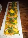 This has not only become our favorite sushi restaurant in town, but one of our hands down favorites...period. The heated outdoor environment is safe, comfortable and intimate. The service is fantastic, and the sushi is incredible, inventive and generous in portion. The rolls are complex and each has several kind of fish, and I recommend the Dirty Blonde and Ex Lover, and always consider the nightly special roll. The sashimi is also awesome, and the thinly sliced cucumber salad is a must.