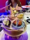 We had an absolutely delightful evening here. It was a Saturday and my 11 year old nephew’s birthday, who was visiting me in NYC. We sat at the conveyor belt counter seats. While the vibe was very family friendly, the food was also good. Beautiful and creative, but also tasty. Our favorite was the carousel of sushi, but honestly it was all good! Highly recommend. The hostesses looked like cat/princesses. The manager was wonderful. And the picture we took as well as the Polaroids they gifted us made wonderful memories! Plan for at least 90 minutes as the courses come in stages. My nephew had a full and exhausting touristy day, but this place still had enough amazement to keep his attention.