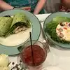 Ambiance a feminine decor heaven, silk floral wallpaper, elegant lighting and fresh roses on each table . Simply lovely and the food was good too!. Loved Bleu cheese dressing apple cider vinegar meet Bleu cheese. Crab cakes and spinich so good. Portobello mushroom wrap and salads all good. Coca cola chocolate cupcake shared by 3. Very good but rich. Highly recommended for girl time. We will return