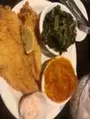 The restaurant was crowded, and the wait was going to be 45 minutes, but we really only waited 20 minutes. The seating inside to wait was a joke so we sat outside and people watched. The music was great both inside & outside. We both ordered shrimp and catfish platter, which comes with 2 sides. I ordered mac n cheese, vegetarian greens and an extra side of yams. My husband ordered mac n cheese, and yams. The cornbread was BOMB.COM lol. Sweet with a touch of cinnamon. The greens tasted like the Sylvia's vegetatian greens being sold in chain grocery stores. They didn't have any umph to them. The yams were great (I didn't get mine, so hubby shared his. Probably universe saying I was being to greedy lol) The fish was ok. It wasn't seasoned hot sauce made it decent. The shrimp were really good.