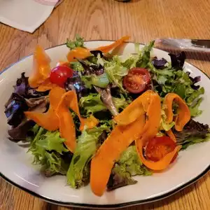 The menu is very hit-and-miss at this restaurant. Some of the entrees were filling and appealing, but some are not. Especially disappointing was the Strawberry Trifle dessert that contained literally two small strawberries in a wine glass full of whipped cream. Just order a glass of whipped cream - that would be nearly the same thing. We decided on this place based on the online reviews and its history. It is charming to look at inside, but an experienced eye can also tell that putting a plaid fabric swatch in a picture frame and calling that wall decor is a lazy way to decorate. But that is literally the art by some tables: fabric swatches in picture frames. Overall, this was a disappointing dinner. Might be a good place to grab a sandwich or salad, but I would have to come back for lunch and find out. Also, our waitress was pretty bad. She was not attentive and when I asked about one item on the menu, she didn't want to find the answer to my question and stalled me. Hoping I would change my mind, I guess?