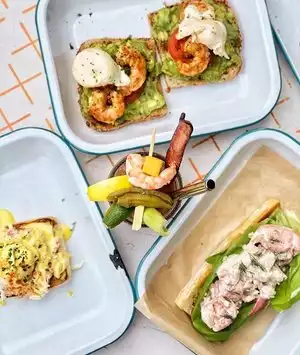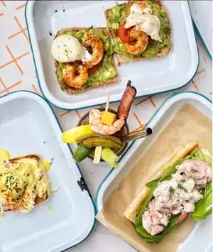 We needed to get out of the house after 10 months of pandemic. Went to lunch there and it was great. It's a casual but pleasant atmosphere. You have to scan the bar code to get to their website for ordering online, the only way you can order. Of course if you just open the camera app on your phone like they ask, it doesn't necessarily get you to the URL, but it will take a picture of the QR Code. After a few tries we got to the menu. Whoever wrote their software didn't do a particularly good job with usability. It too a few tries to get the two lobster rolls and mimosa added to our cart. Checking out was a hassle too. The blank field for my last name didn't show up as anything but a blank field. After noticing our frustration, someone came over and pointed out that they needed that field filled out as well. The lobster rolls weren't cheap at $35, but they were huge. It appeared to be a whole lobster in each and we're happy we didn't order anything else because lobster is filling. We both finished ours easily but now, an hour later, it's sitting heavy (but nicely) in my very satisfied belly the way lobster does. Lobster is one of our favorites foods. This was cooked perfectly and about as good as it gets.