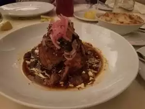 Oysters Rockefeller with chorizo, bacon wrapped quail with mezcal glaze was a top dish, blue crab claws were a bit tough and chewy. Pierce pibil very well done. Great service as well.