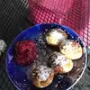 We sat on the patio with well kept flowers and good shade on a hot day, blown away by the authenticity of the dishes. The bread had a lovely nutty flavor and the red cabbage salad super flavorful. The smoked salmon “Benedict” as amazing as it sounds, served with a rich butter/ lemon sauce with a hint of chili. The pancake ball quartet was well made and the perfect end. Service perfect as well. Nothing like this in San Diego, hope it stays open forever.