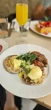 Reserved table in the Crystal Room for a 10am brunch. Beautiful sunny day in this iconic restaurant. Enjoyed the pastry basket with bottomless cup of coffee-topped up numerous times by our attentive and pleasant server Plato. Perfectly cooked poached eggs on the Eggs Benedict.
