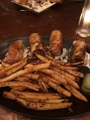 They are doing so many things wrong, with maybe a few things right if you get lucky. Men’s bathroom, soaking wet and a mess. Outside dining mandatory on a very cool night with 33% too few propane heaters, just plane cold for many guests, Unexpected food preparation, over seasoned and fried; Fishy tasking fish; fishy tasting taramosalatta; Yup, Yup, Yup. Tell me where in these two descriptions the guest would have a clue that these were essentially fried egg rolls posing as a gyros? No bread, no separate meat/fish, no warning from waiter. And, the duck couldn’t be tasted as it was way too over powered by the cumin spice which was all you could taste from in the pastourma seasoning. The chicken lemon soup was ok, but didn’t care for garbanzo beans and loose texture, the saganaki fried cheese was excellent, and cucumber tomato salad as expected. Unfortunately, we didn’t do any of the grilled meat choices, although I thought I was getting it with the duck. DUCK GÝRO Spit-roasted duck breast and leg rubbed with pastourmá spices, yogurt sauce, Pontian satz bread, pomegranate reduction, pickled chard, fries FISH GÝRO Spit-roasted sea bream, red cabbage salad, Cypriot tahini sauce, fried colocasi Our waiter was very friendly, just a tad scarce, but service was fast. If you want more predictable Greek food, venture to Greek town and get familiar comfort!