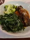 Slow service, but friendly service. Food was very good overall. Onion rings were yummy. Salmon dinner was nice. Steak dinner was perfectly cooked. Mashed potatoes are super. Charred broccoli was perfect. Just took too long. Oh well.