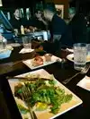 Why do the darkest restaurants have the smallest menus with the tiniest font? This is one menu you should not be trying to hide. The food here is excellent and they'd sell a lot more of it if you weren't selecting the easiest item you can make out. Either print a nice crisp menu on white paper or just let everyone pull out their bright phones that blind us all. It looks like concert with all the phones being waved around. So maybe this a dark mysterious concert hall: Lively crowd, several bars, lots of staff and the real star - the food.