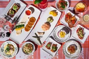 A fabulous location ! Sat outside on the terrace , overlooking the gorgeous landscaped pool area . Amazing food ! Excellent service - what else could you wish for ? Wondered around the Hotel to taking in the amazing colourful installations - great atmosphere ! We absolutely loved it - perfect ! !