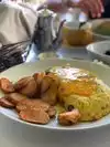 The meal was amazing Pastor chicken with eggs over easy. Service was fantastic also. The seating was average and the noise level was high. $125. Ish for breakfast was pricey even tho the meal was very nice.
