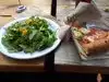 Popular place, lots of people. They had beer... and simple food. Sandwiches and such. If you sit outside, watch out for sitting under the trees... they drop tons of seed things into your food and drink.