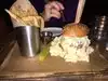 Slow service Husband had the french onion burger. The french onion soup was bland broth, luke-warm. Burger was good. I had the Trash Can Nachos with chicken. The sauce was soupy. The guacamole was good with it.