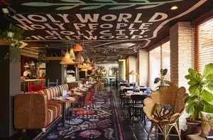A fascinating food hall, with a variety of international vendor/chefs around rather perimeter and a shared seating area in the middle. Rooftop space as well. Even some live music at certain times. A great selection of food/drinks with an international flavor and an upscale vibe. Worth a visit.