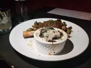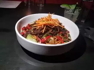 Came here for my birthday dinner, as I have wanted to get in here for a while. It didn't disappoint. Smart money would make a reservation to secure your table. Started with drinks, the Whisjey Ginget Smash & The Peachtree. Both were good. For food, we started with the oxtail bao, which was good, but just needed some more oxtail gravy in it for flavor/moisture purposes. For our entrees, I had the oxtail lo mein, which was amazing. It was a very hearty portion, so I had plenty to take home. My wife had the braised lamb shank, which came with cassava au gratin, and mushrooms. She subbed the spinach out for the fried brussel sprouts, which were amazing. The food comes out fast, even with the place about 70% full. Bar scene is very active in the evenings. Even the bathroom was really nice. There is plenty of free parking so no extra charges there. Definitely a hidden gem.