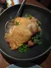 Excited for dinner at The Duck Inn last night and preordered the whole rotisserie duck. The vibe is cozy and retro—nice neighborhood spot by the river. Service was friendly but average. Starters: Duck wings were flavorful but way too salty. Brussels sprouts were crispy and delicious. The Duck Inn Dog (Chicago-style with duck fat) was a big, tasty portion—solid highlight. The whole duck, though? Disappointing after a 40-minute wait. Breast came undercooked in places, under-seasoned (sauce didn’t help; we added tons of salt), and the fat was chewy and inedible. Legs were better, but overall, it didn’t live up to the hype or price.