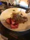 I loved my unique green humus just wish they would’ve given me more things to dip in it for the price it really didn’t come with many veggies or Pita bites for dipping. My husband said the flat bread was ok kind of small for the price. The atmosphere is very fun & relaxing. We were visiting from out of town & met up with friends who live in our same town & happened to travel here on the same dates so that was interesting timing & very fun. Delicious strawberry shortcake!!!
