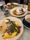 Awful! The staff have the personalities of gray rocks. The breakfast menu is limited. The coffee is on the bitter side. I had the mushroom omelette. Pretty but nothing more than folded over scrambled eggs with a few mushrooms and a little dry Parmesan thrown on top. So, I ordered a side of hollandaise, but it had a very salty taste. Hubby had the H&H, but on a Monday morning at 8:30 they were already out of ham. He said the bacon & potatoes were pretty tasteless. Everything was served just sort of warm. Obnoxious music was too loud and the bolster seating was uncomfortable. I cannot recommend this place for breakfast.