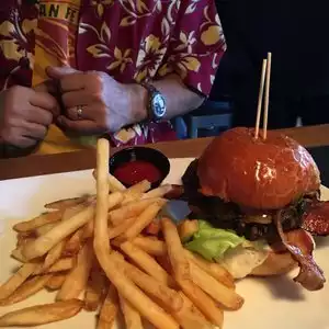 Stopped by for the first time yesterday at lunch. Had a burger and sweet potato fries. Both were very good! Would get again. Great location with indoor/outdoor seating. Nice laid back atmosphere. Will go back.