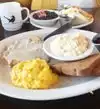 On occasion really greats service can overcome mediocre food, and rare occasions great food can overcome poor service. Neither was the case in this instance. According to an article the Dallas Observer the owner's goal was for everyone to go through the line and have there food within 5 minutes. We waited for 20 minutes to get our food after we had already paid. Besides being completely self serve. Refills on coffee and other drinks are not easily accessible because of the flow of the restaurant. When we got our food it didn't come at the same time. It was Not hot, Luke warm at best. We paid for cold food. The eggs were cold, the breakfast potatoes were overcooked and cold, the bacon tasted okay but was luke warm. The biscuit was so hard it think I could have cracked the concrete with it. The gravy had no flavor. To make our first time experience at this diner even more memorable the guy cleaning off tables comes to our table while we were still eating and starts reaching over my food to clear the table. It was on par for the rest of our meal. We left and won't be back. Horrible value for the money.