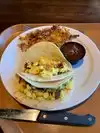 Stopped in this morning for a breakfast on my way to a business meeting near Love Field. I had been here last summer for lunch and thought it was ok, so I assumed breakfast would be at least as good. Well I was wrong. It’s a “grab a tray & get in line” afffair for breakfast. Just like the high school cafeteria. Pans of scrambled eggs, pancakes, bacon, etc.... sitting in there in a hot water bath. I had stopped in hoping to order an omelette. Not an option. So I ordered the “breakfast tacos” which consisted of 2 smaller size tacos that they assembled right there on the line with “stiff” flour tortillas, scrambled eggs and bacon. They were very average at best, and that’s really trying to be kind.. I ordered a side of hash browns which were nice and crispy and tasted pretty good. If your looking for a nice sit down breakfast, made to order, this is not your place.