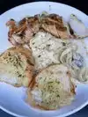 The food was actually quite good. We had bacon wrapped shrimp for an appetizer - I had the rainbow trout with broccoli and bacon and my husband had the blacked shrimp alfredo. The shrimp were cooked perfectly and the bacon just the way I like it - thick cut and crispy. The trout was very well cooked, tender and juicy. I highly recommend the broccoli and bacon if you enjoy a little heat. My husband enjoyed his alfredo, finishing every bite. I also thoroughly enjoyed my first taste of moonshine with a Porch Sipper. We enjoyed the outdoor seating, it was a very entertaining corner. They are very busy on Saturday night, so the food was a bit slow arriving, but everyone who came by checked on us and made sure our drinks stayed full.