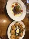 Eclectic vibe with plenty of screens showing sports. Important info for those wanting college to pro games like baseball. Service is great! I could sit anywhere. Food presentation is fabulous. The fried tomatoes appetizer is not quite what I expected. Being a Texas girl I figured the fried green tomatoes would be cooked a bit more but they’re essentially batter fried but leaving the tomatoes still crispy. The crab topping and arugula light salad is a perfect compliment to feeling like I’m eating a full meal without being a “salad “! Nicely done Moonshine!
