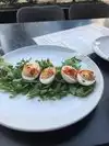 Try the Midnight Mule! Made with Texas Moonshine. We also got their sampler: fried green tomatoes, fried pickles and deviled eggs.