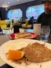 We showed up at peak breakfast Sat Am (around 10am) - admittedly a bad idea. It grew crowded and very, very noisy. I'm on crutches by the way, and there is NO disabled parking in front, or in back. Coming from the back, there are a short set of stairs and a long, linoleum floor hall way to the dining room. The dining room, when busy, affords you NO path to one side or the other of the dining room - you pretty much just have to impose on everyone to make way. In a fire, you'd just have to wait for everyone else to leave first. So - not a great facility for mobility challenged - a wheel chair simply wouldn't work at all. That said, the wait staff was friendly and attentive, and the pancakes and french toast we had was quite good.