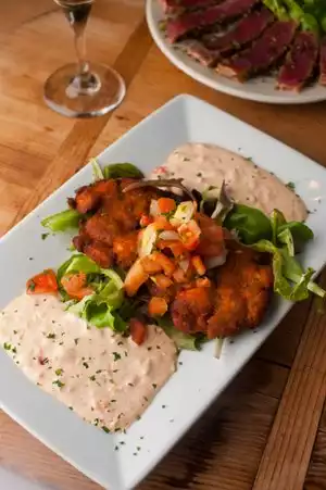 Though the fare has a Texas influence it is NOT a Tex-Mex restaurant. First impression was the ambience. It really did have a good vibe. They had a bar you could sit at or if you prefer tables for more formal dining you have that option. In addition to a decent wine list they also serve a nice variety of Texan craft beers. I had a nice blonde ale while my girl friend enjoyed a sparkling rose. We opted to order the variety sampler platter to experience their different takes on local foods. Normally I am not partial to crab cakes, but the southwest inspired one they had was very tasty. The tower of onions were good as was the quesadilla with veggies. It also contained flautas and fried oysters. The tomatillo sauce was awesome. For dinner we had the trout and the filet. I thought the trout was just right. We had ordered the steak medium rare but had to send it back. It was more rare than not. Otherwise the steak was delicious too. I would definitely go back and try their pork chops. It was my preferred choice but I wanted something light. Definitely a good place to visit. PS the pico de gallo was very good too.