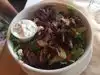 The Raven is located in a residential neighborhood but on a major street not far from the Texas Medical Center. The menu offers many choices, but today I selected the balsamic vinaigrette strawberry spinich salad with spiced pecans and feta cheese. Several toppings were offered and I selected the grilled salmon. The combination proved to be excellent and the meal was completed with a generous slice of moist carrot cake. Hughly recommended.