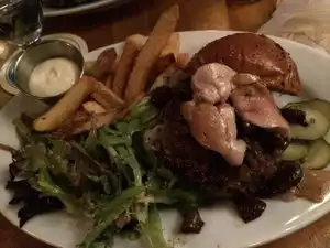 Food was okay, French fries were great, salad was good but in general just okay. The location is in a bit of a shady area. Service was good and friends enjoyed a good selection of beer.