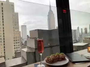 Rooftop bar on floor 30 overlooks the city with the Empire State Building front and center. Self serve bar has decent wines and good snack. The coconut shrimp, charred edamame and shishito peppers and the pretzel bites with cheese fondue were all tasty. Worth a stop just south of Times Square for a sunset cocktail